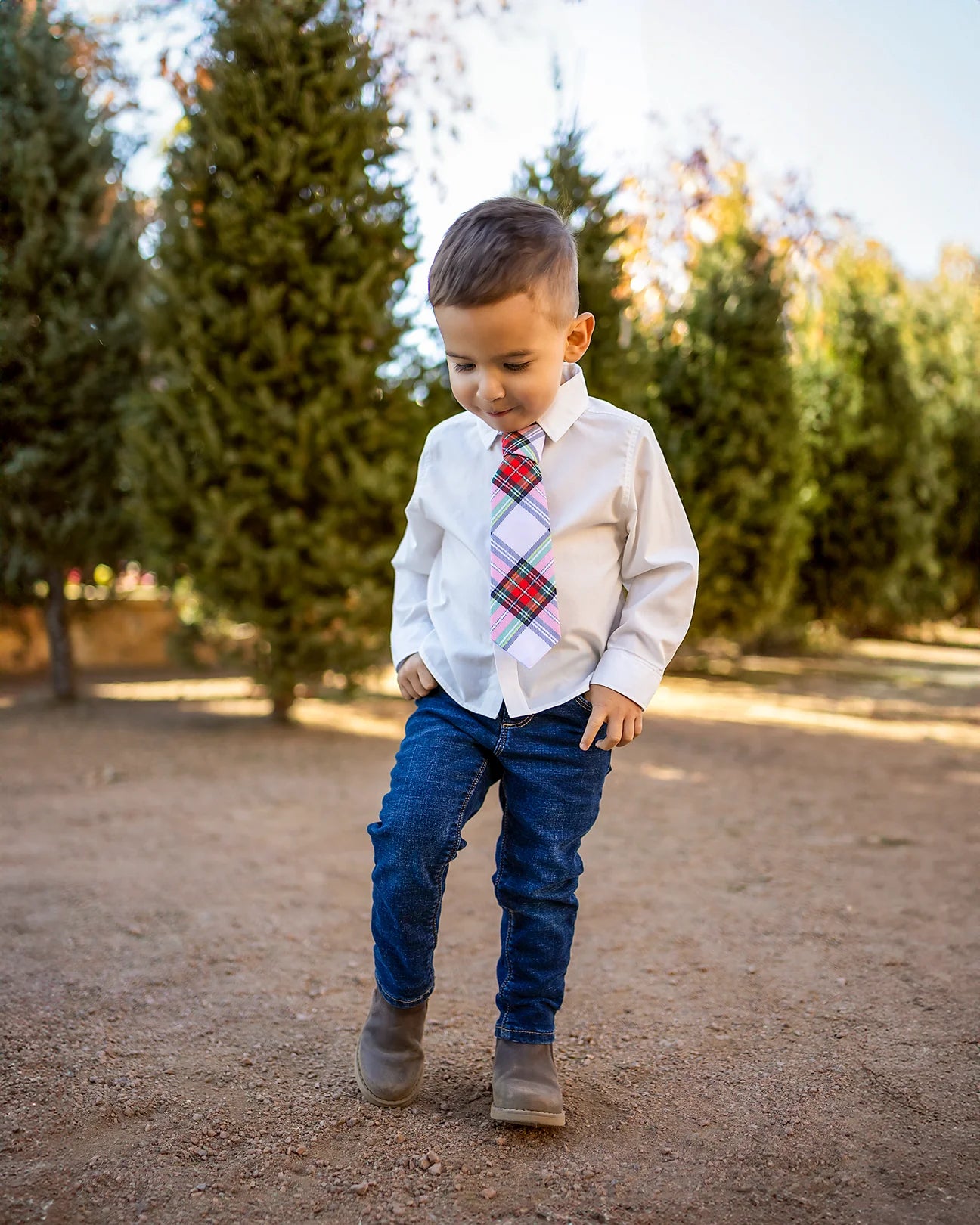 Add a splash of fun and style with these playful red plaid woven ties for boys. Designed with a simple Velcro attachment, they're easy to wear and perfect for little hands to manage on their own. Ideal for dressy occasions or adding charm to everyday outfits, these ties combine convenience with a dash of spirited color.