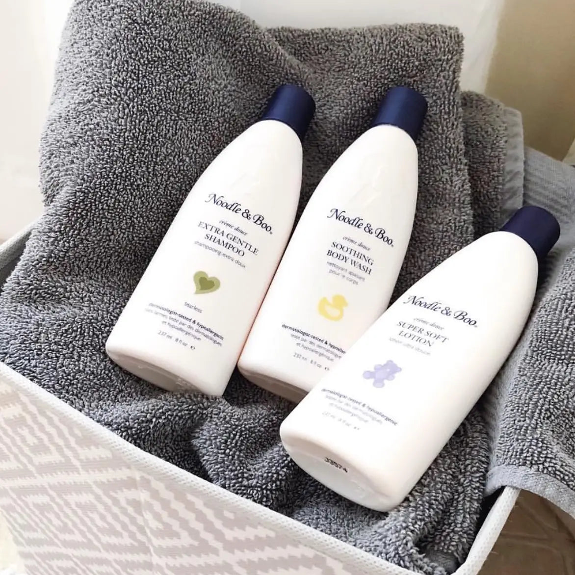 The perfect starter for a baby’s luxurious bath routine, this set includes three gentle formulas to cleanse, soothe, and nourish delicate skin from head to toe. Set includes: • Extra Gentle Shampoo (8 oz) — High-moisture, low-suds formula enriched with provitamin B5 and vitamin E to cleanse hair and scalp while leaving hair soft, shiny, and healthy-looking • Soothing Body Wash (8 oz) — A calming, soap-free wash with allantoin, provitamin B5, and vitamin E to gently cleanse while rebalancing skin’s natural pH and providing lasting hydration • Super Soft Lotion (8 oz) — A silky, lightweight lotion with sweet almond oil, allantoin, and vitamins E and C to deeply moisturize, soften, and comfort baby’s delicate skin • Gentle formulas developed especially for baby’s delicate skin • Mild enough for daily use, safe for newborns and babies with sensitive skin Why You’ll Love It • A thoughtful trio of baby bath-time and skincare essentials • Clinically tested and trusted for newborns and sensitive skin • Convenient starter sizes make it an ideal gift for new parents • Turns everyday routines into moments of soothing care and bonding Our Promise: • Hypoallergenic • Pediatrician-tested & Dermatologist-tested • Cruelty-free and Non-toxic • Made in USA • Free from Parabens, Phthalates, Sulfates, PPGs, and Dyes
